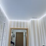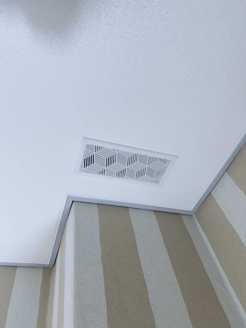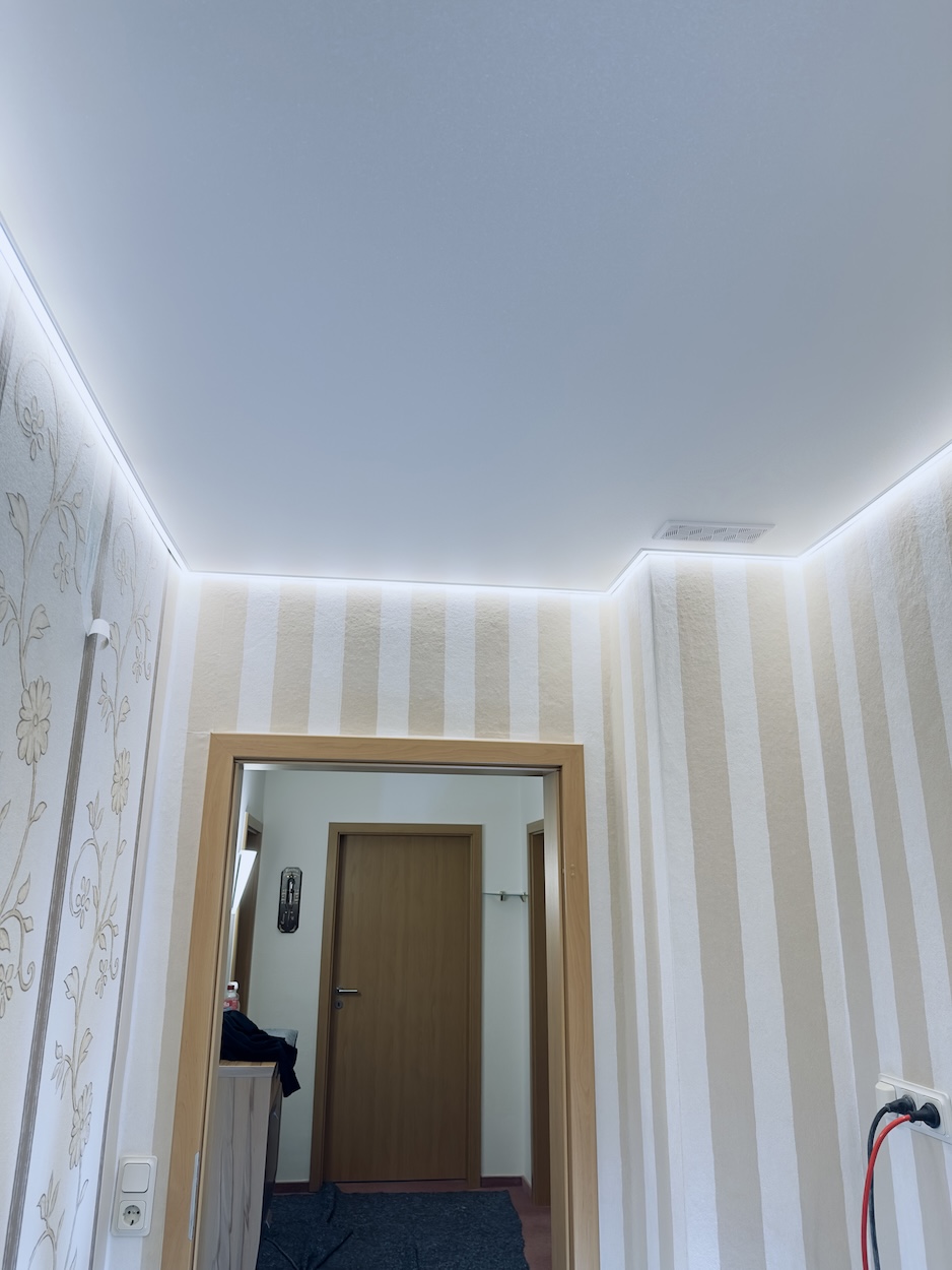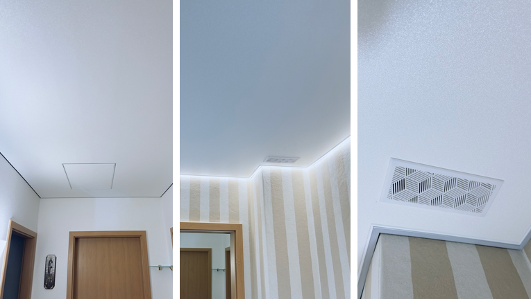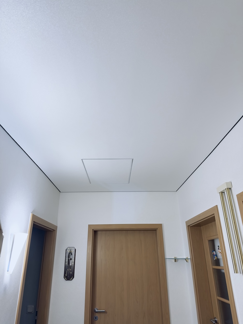 Hier wurden zwei Flure mit einer Gewebespanndecke mit Pailetteneffekt neu gestaltet. Im ersten Flur wurde eine Revisionsklappe für den Zugang zum Dachboden integriert, im zweiten Flur wurde eine umlaufende LED-Lightline verbaut. Um einen eventuellen Austausch vom Trafo der Deckenbeleuchtung so einfach wie möglich zu gestalten, wurde hier unser neu entwickeltes Lüftungsgitter montiert. Dies wird mittels Magneten an der Decke gehalten.